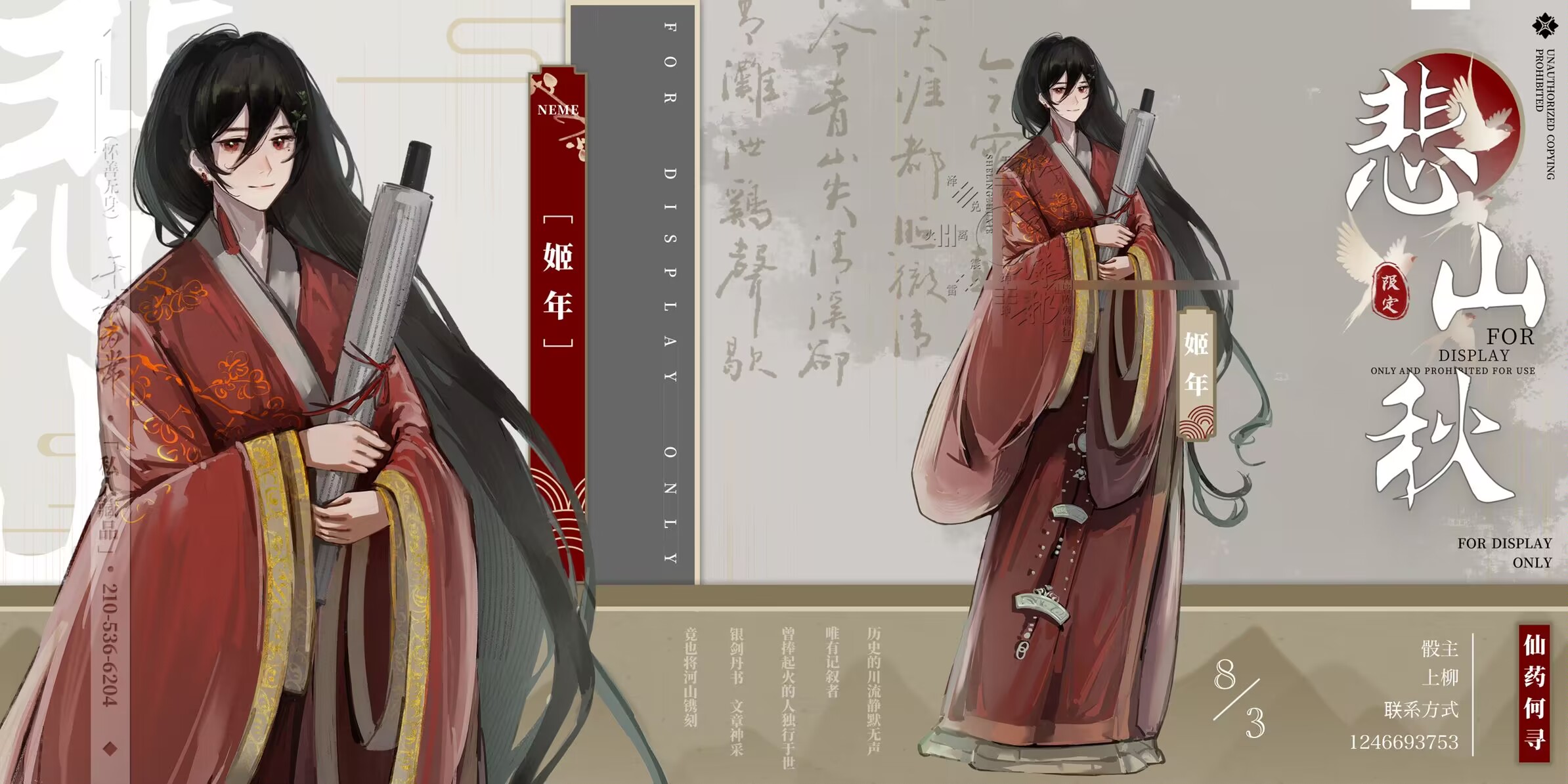 姬年身形修长,肤色偏浅,黑发红瞳,流风回雪、明月入怀之姿。